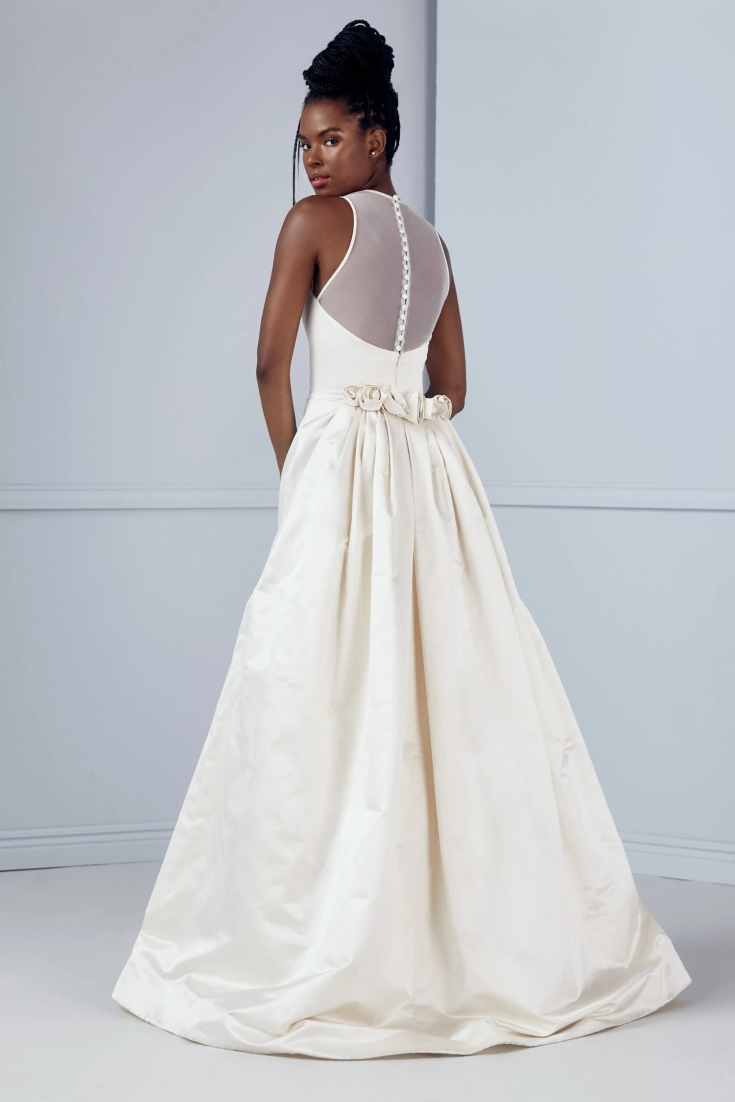 As the singular dress with which Amsale launched her first collection three decades ago—and inspired by her own wedding gown—A101 is the icon of AMSALE. Tailored in the house’s signature Duchess satin fabric, the gown has a classic column silhouette and sheer illusion back, and a row of hand-rolled silk rosettes at the low back tops a dramatic pleated train.