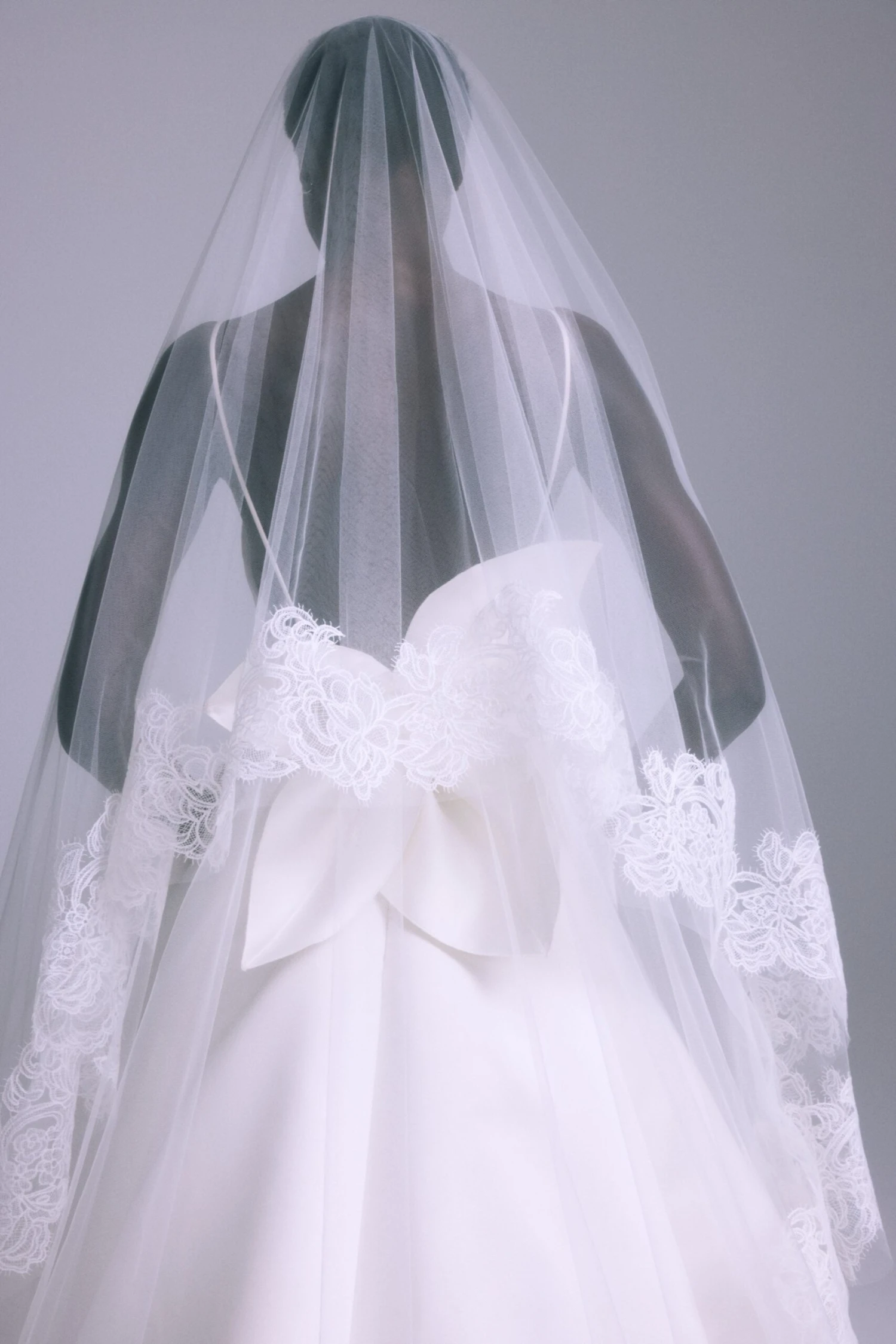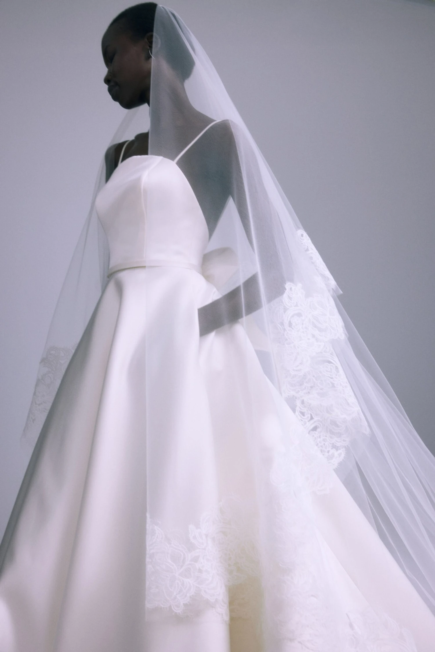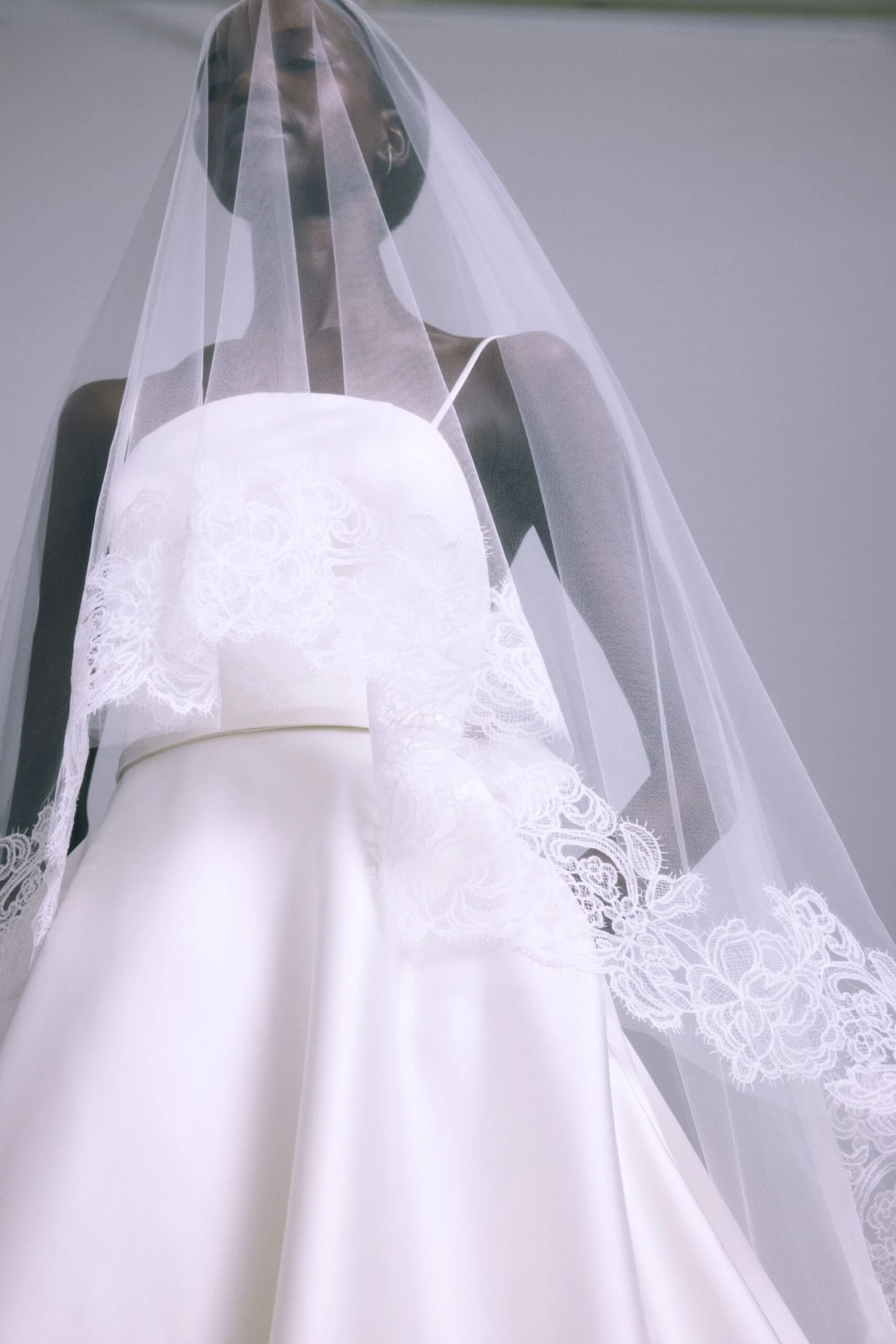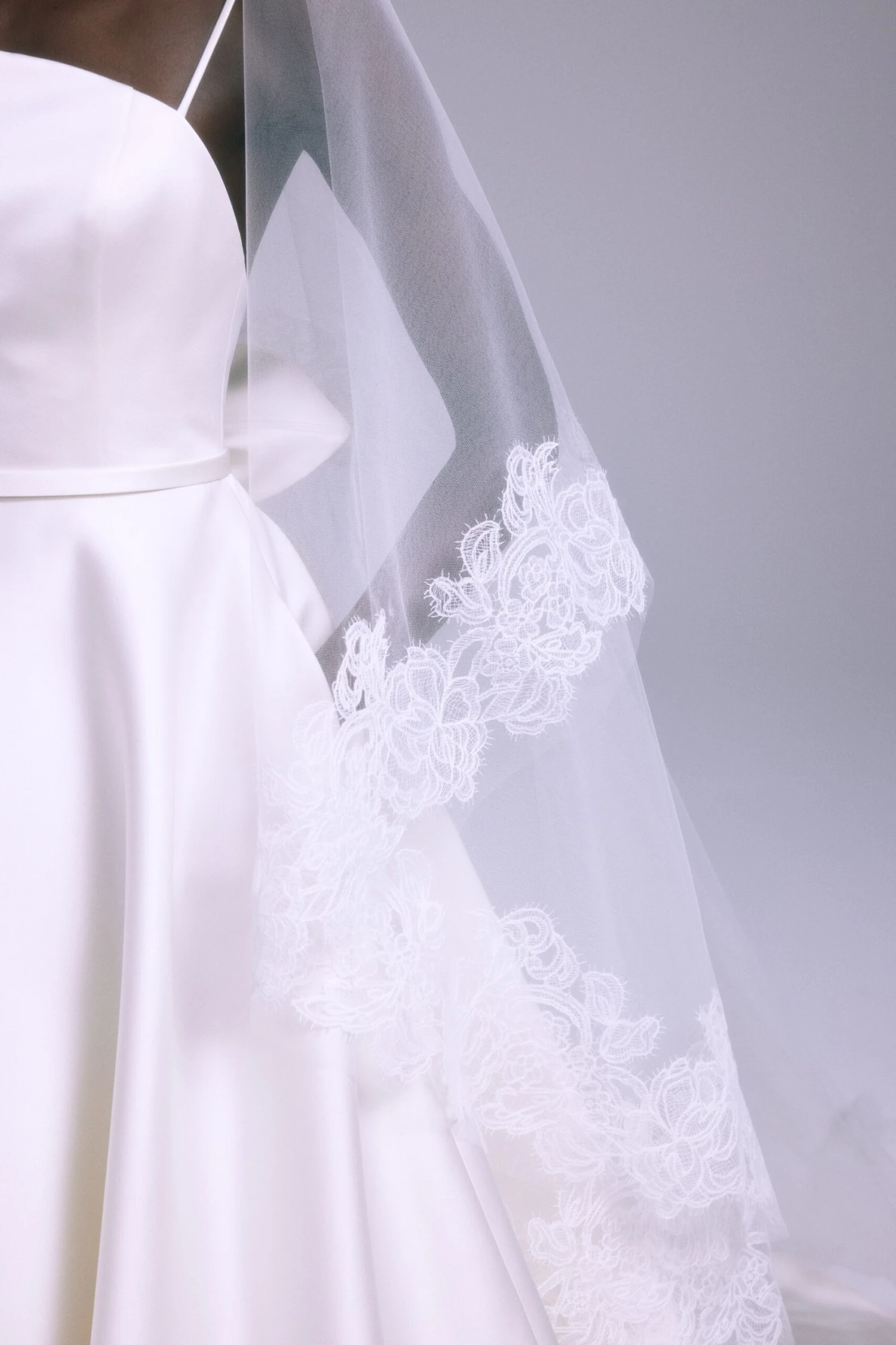 Wide modern lace trimmed cathedral veil with blusher.