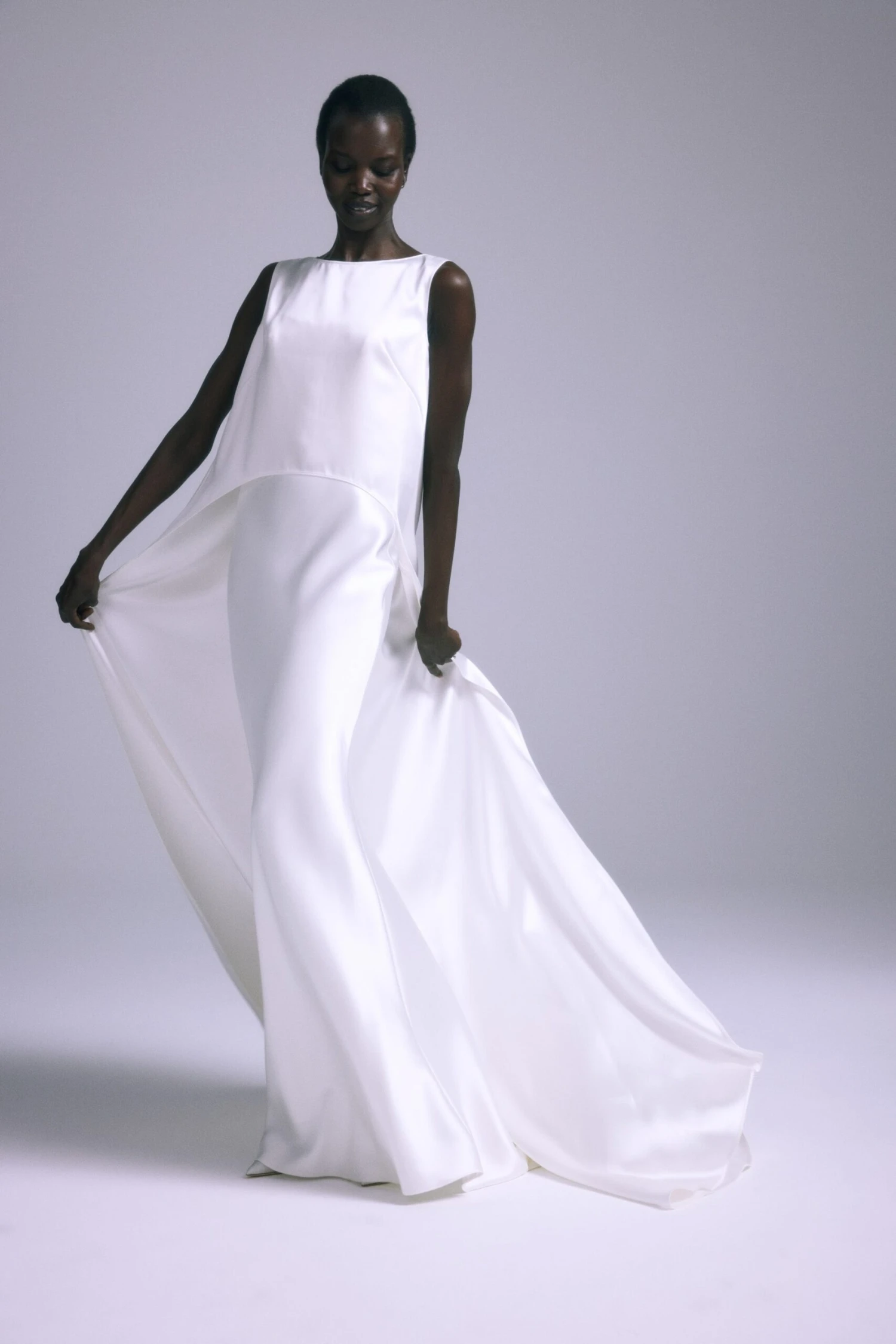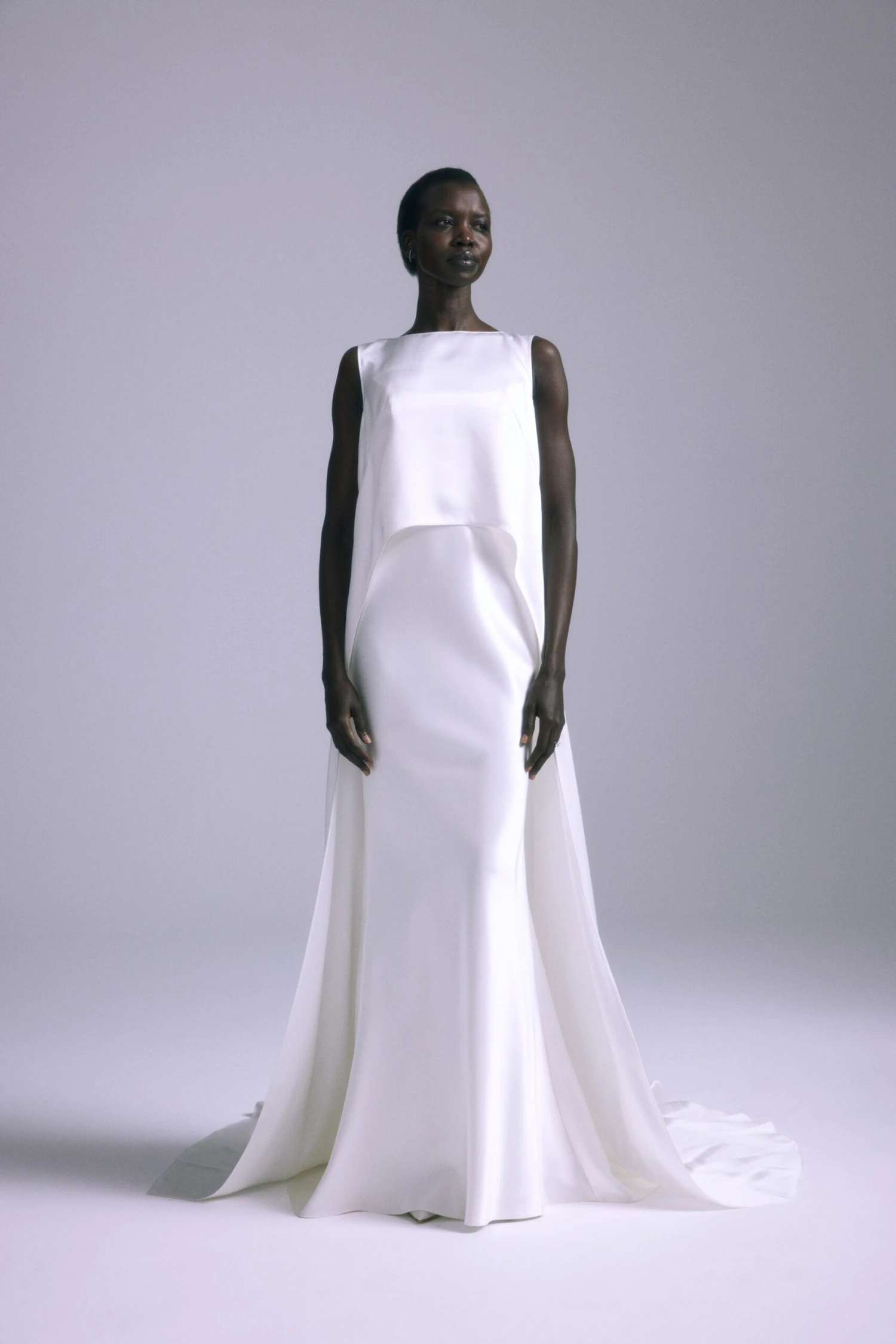 Italian double-faced liquid satin topper with train, styled with AMSALE Haiku.