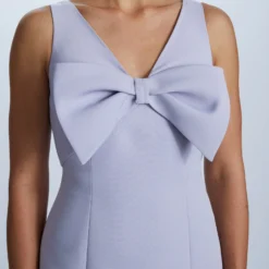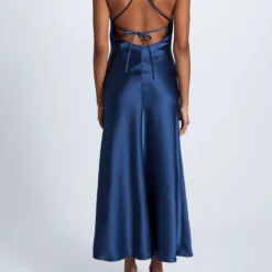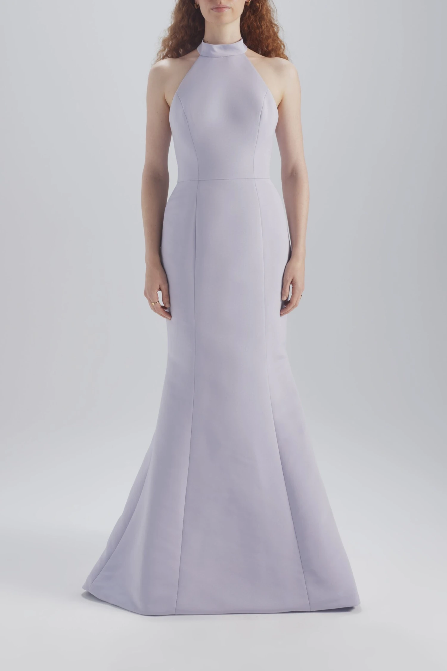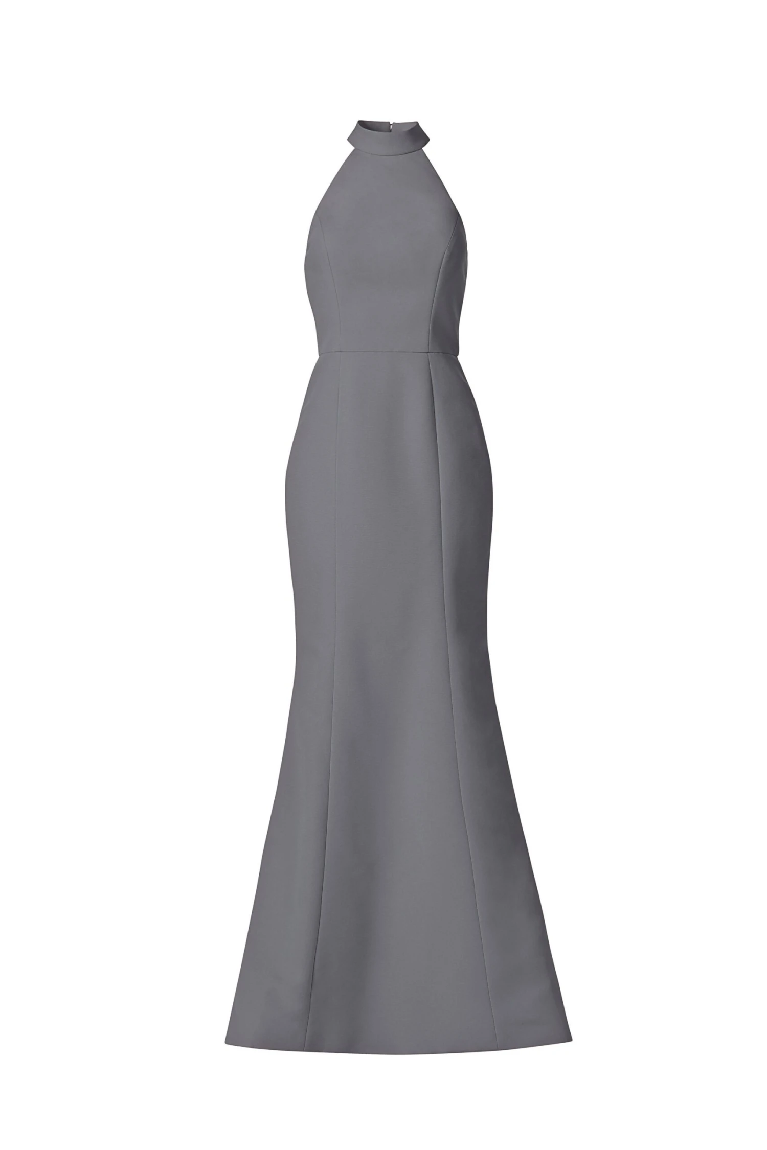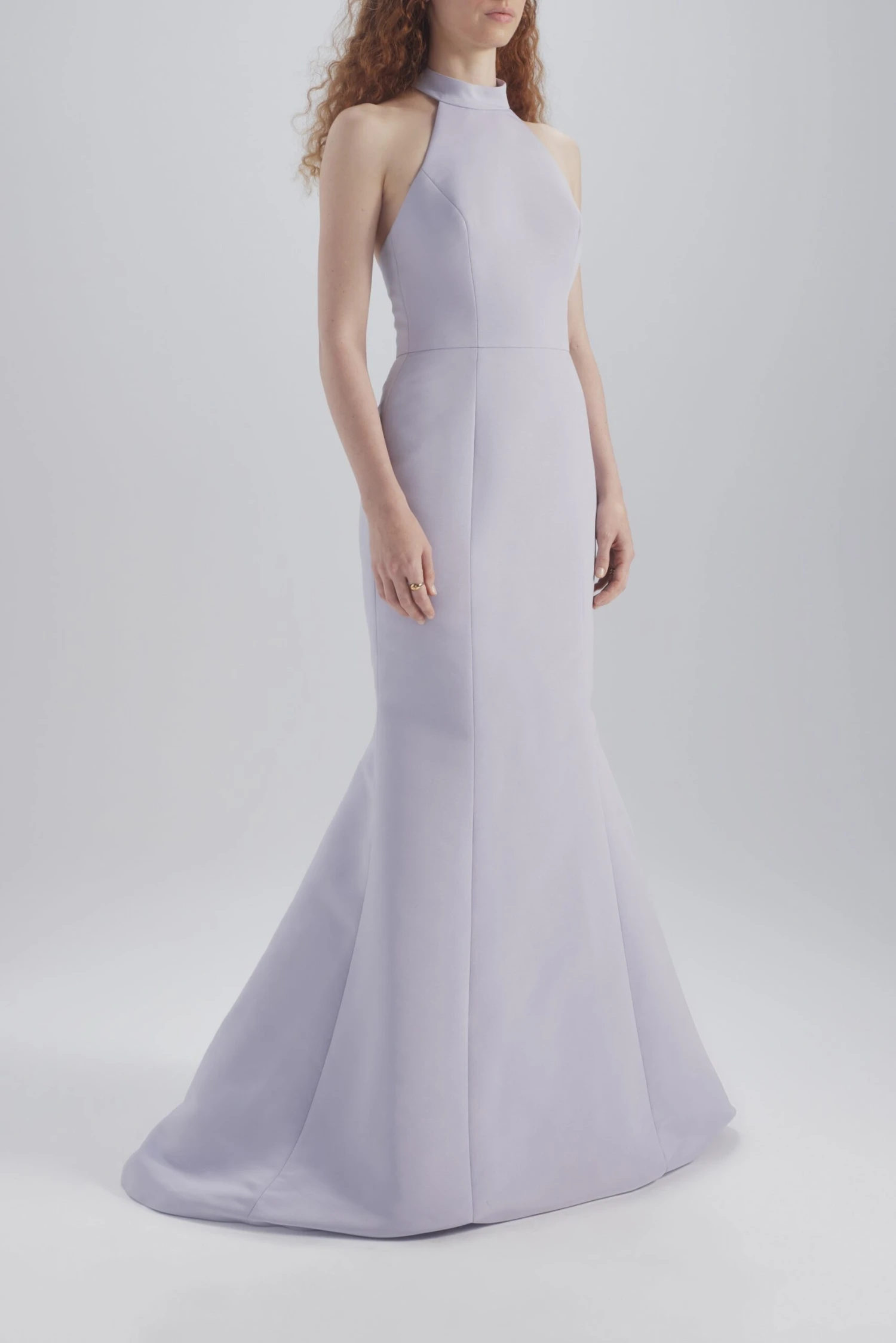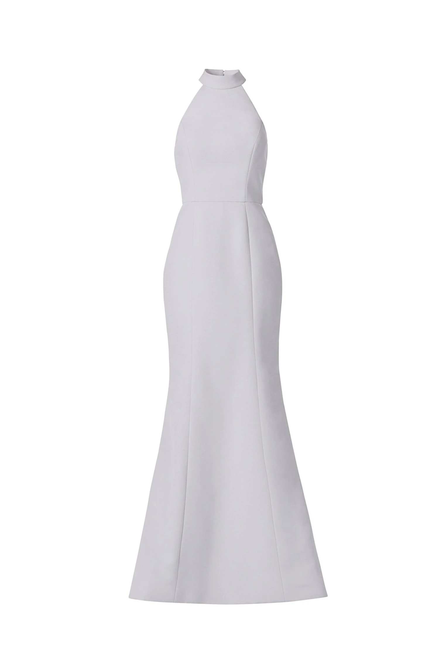 A sleek halter fit-to-flare, this gown is refined yet decidedly modern, with clean lines supported by structured faille. The high collar is secured at the back of the neck with chic covered summarys.