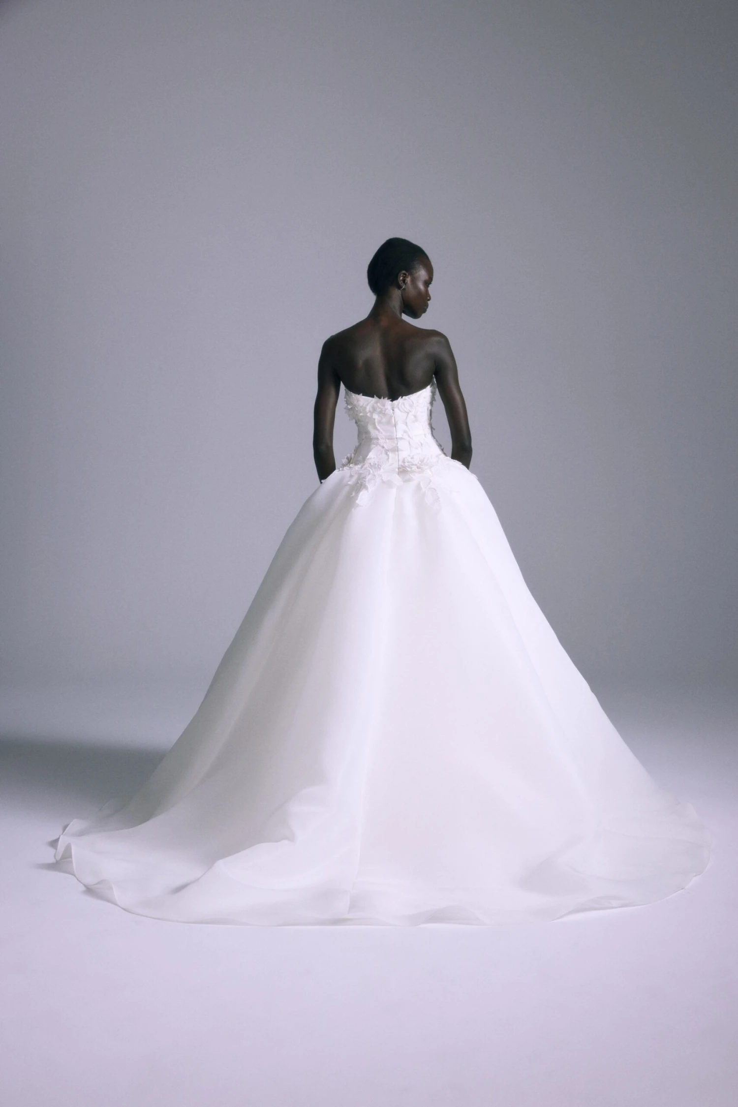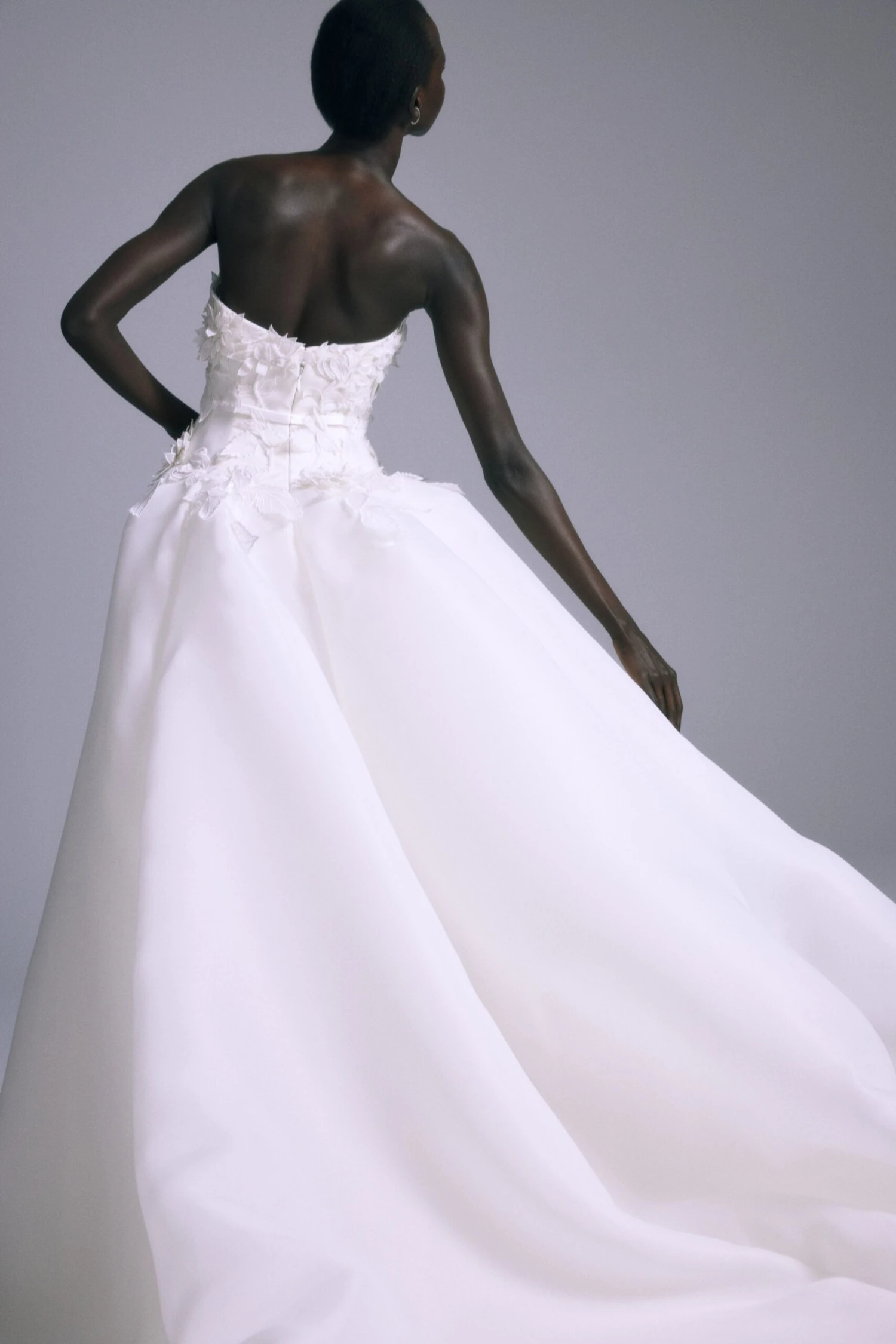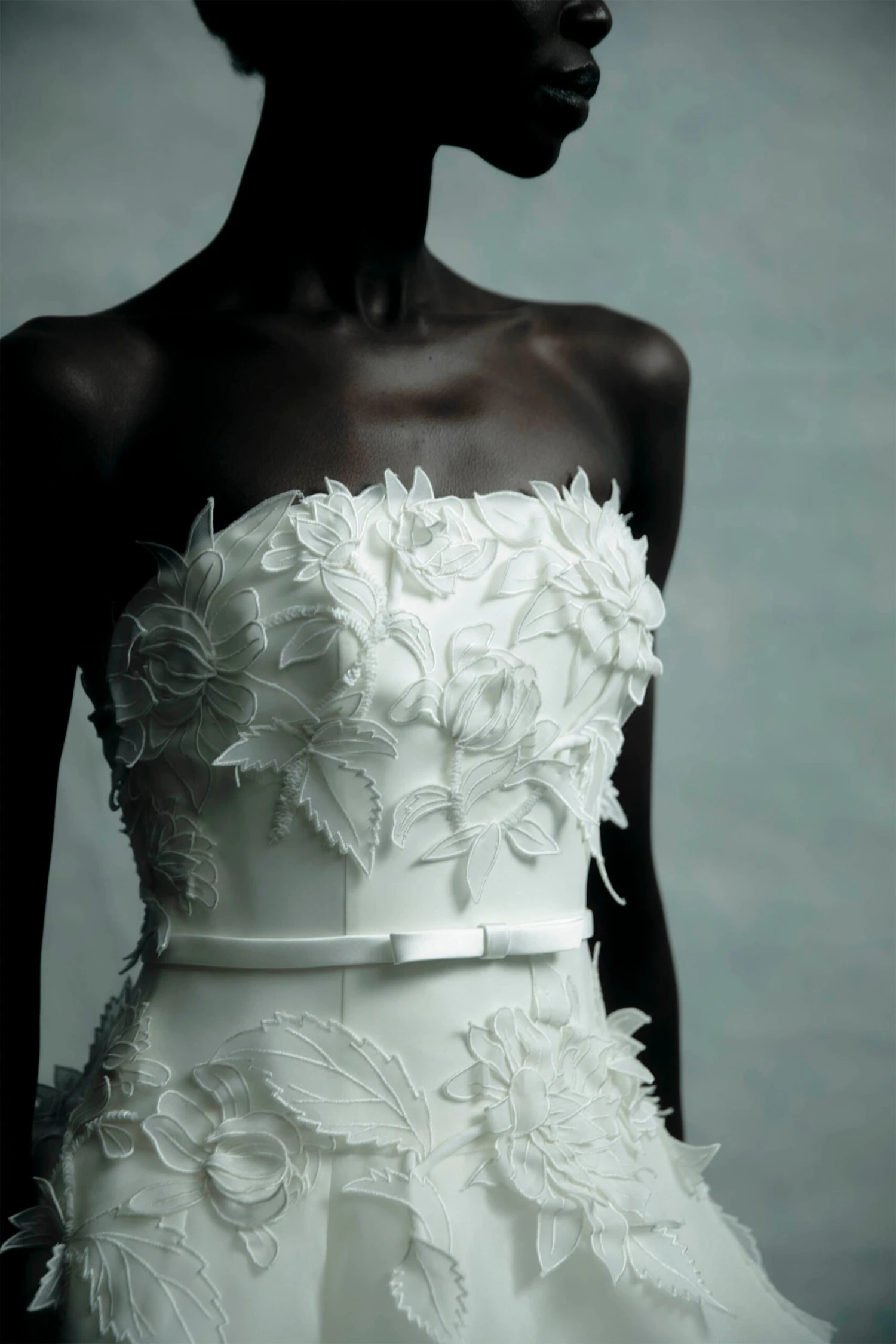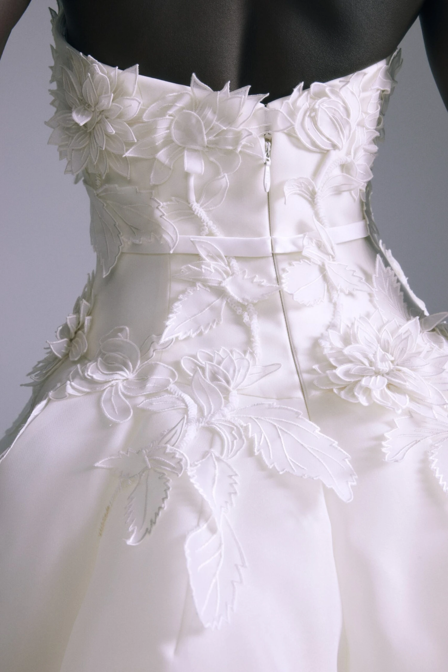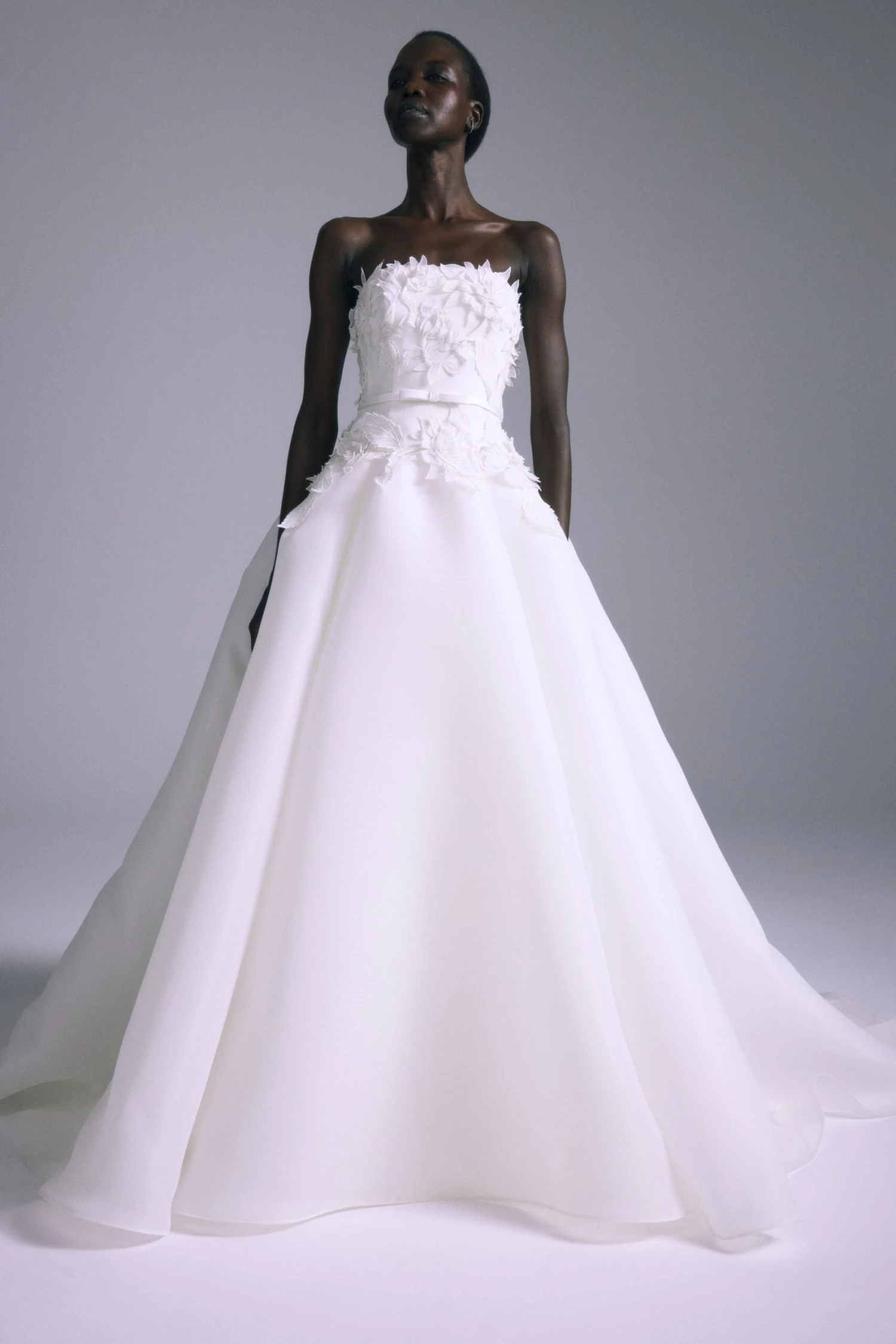Gazar dropped waist ball gown with 3D hand embroidered flower detail.