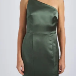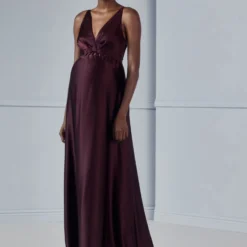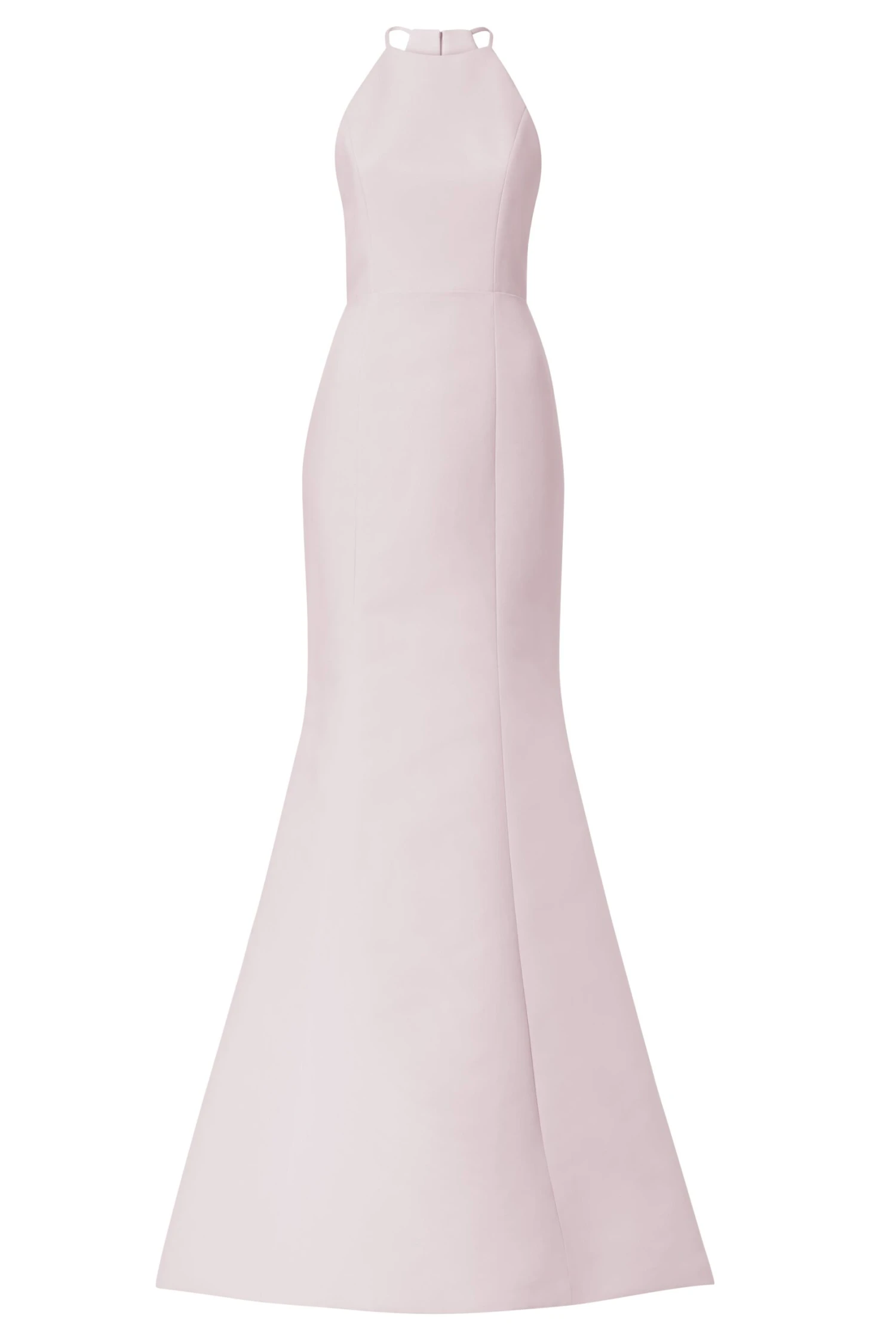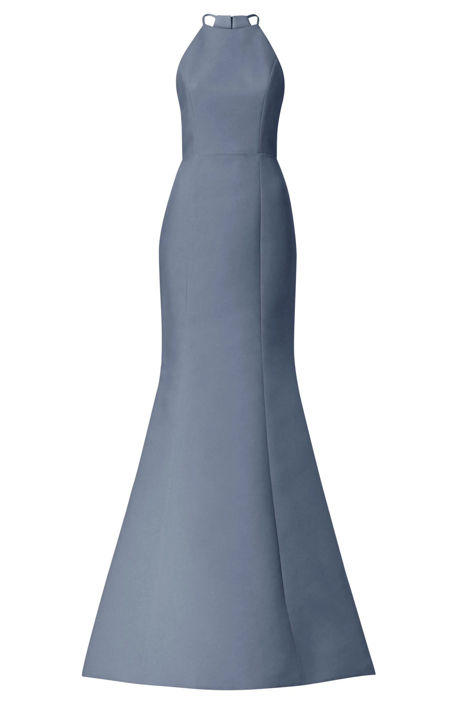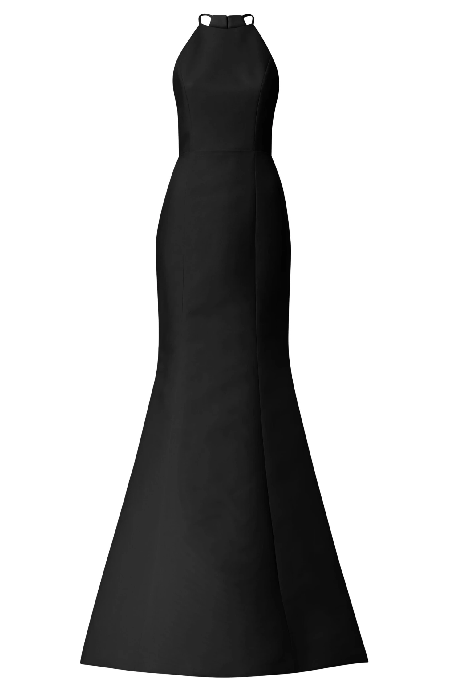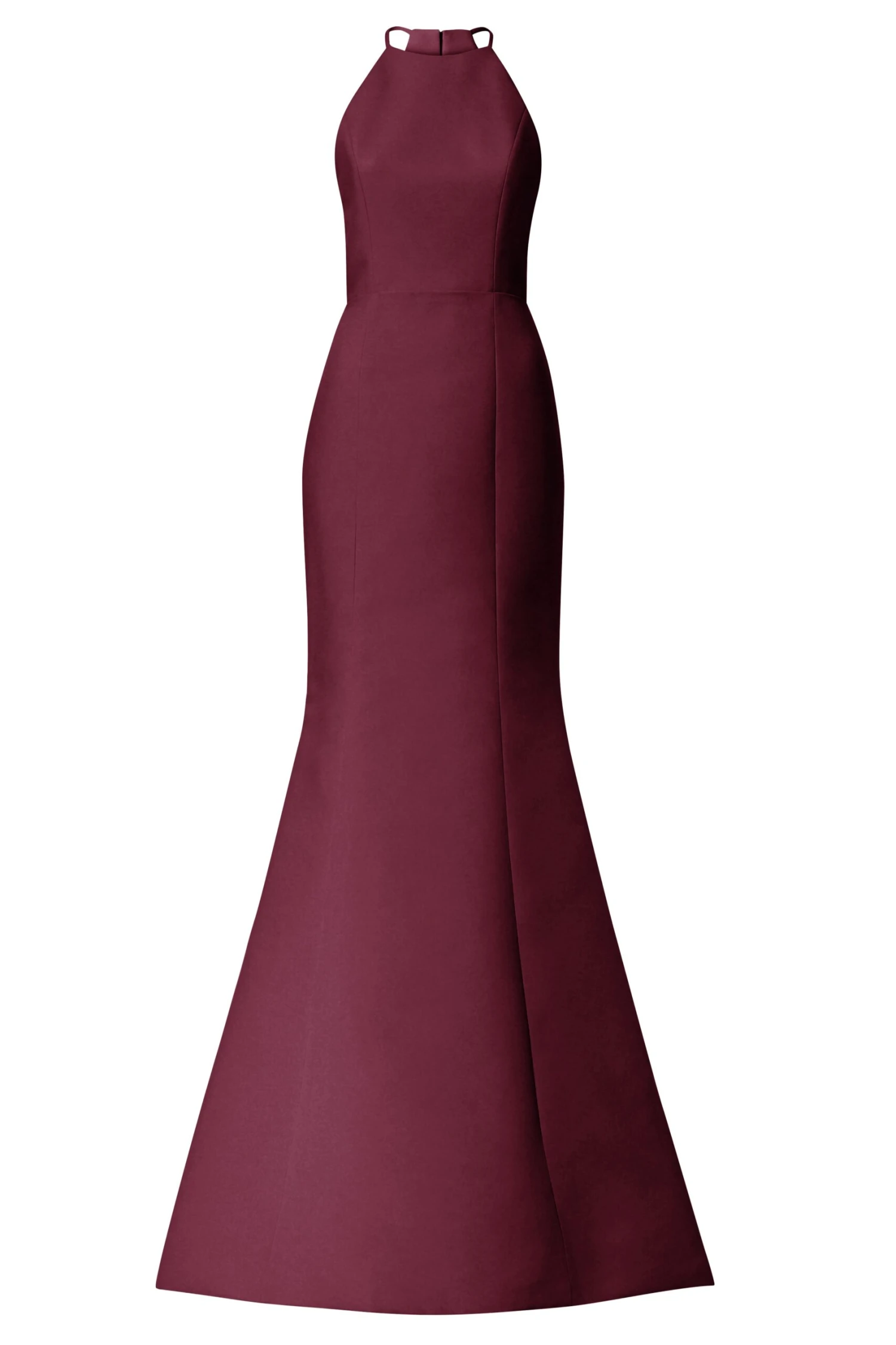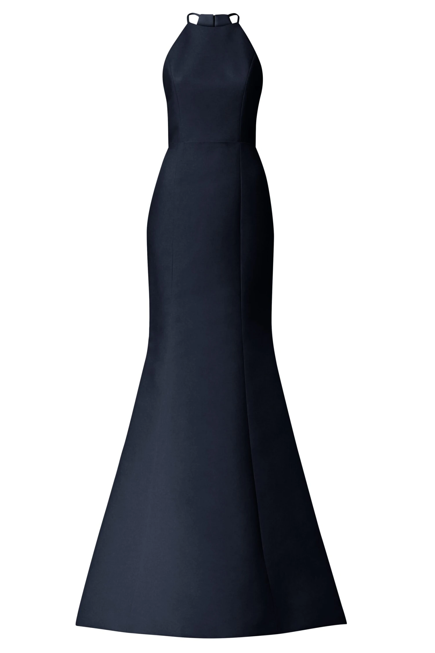 This high neck, racerback style is beautifully constructed in textured faille and has low armholes and an elegant fit-to-flare skirt.
