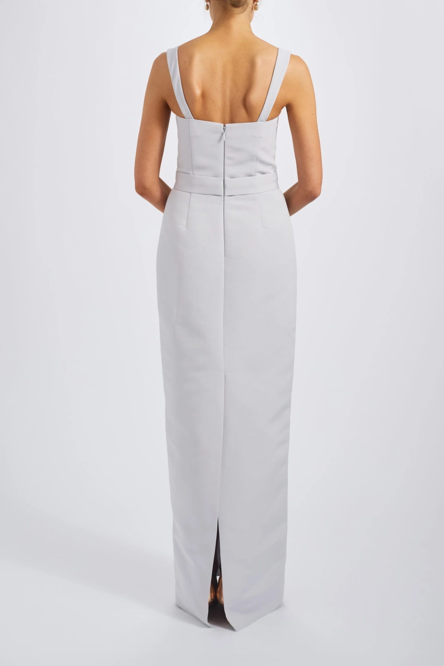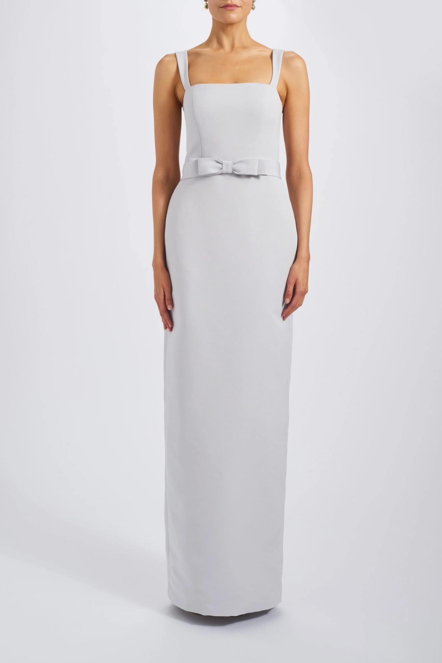 Column dress in faille with square neck and bow detail.