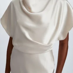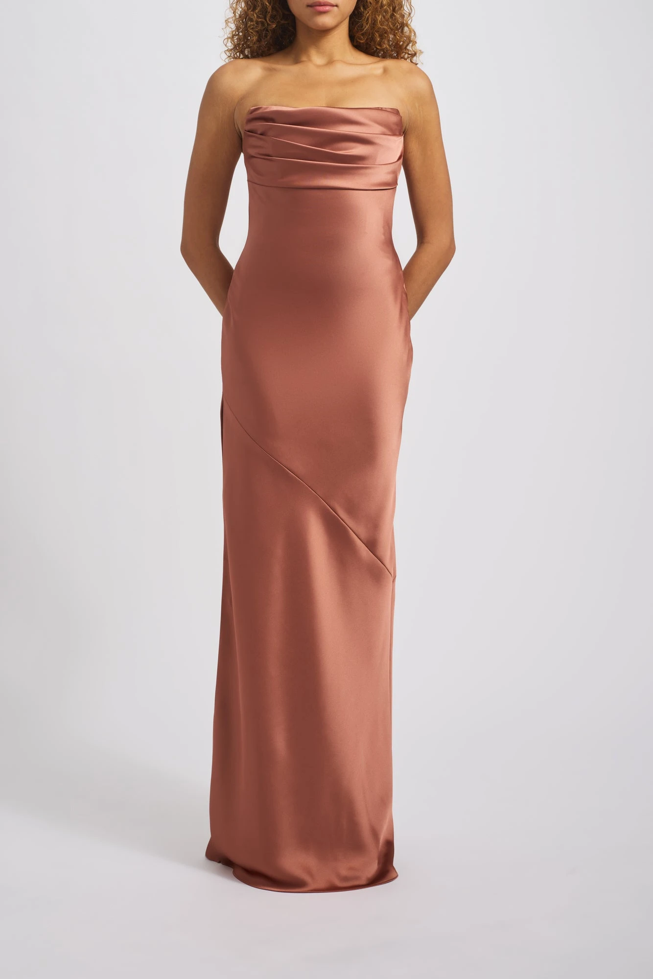 Strapless cut-on-the-bias gown with draped neckline in fluid satin.