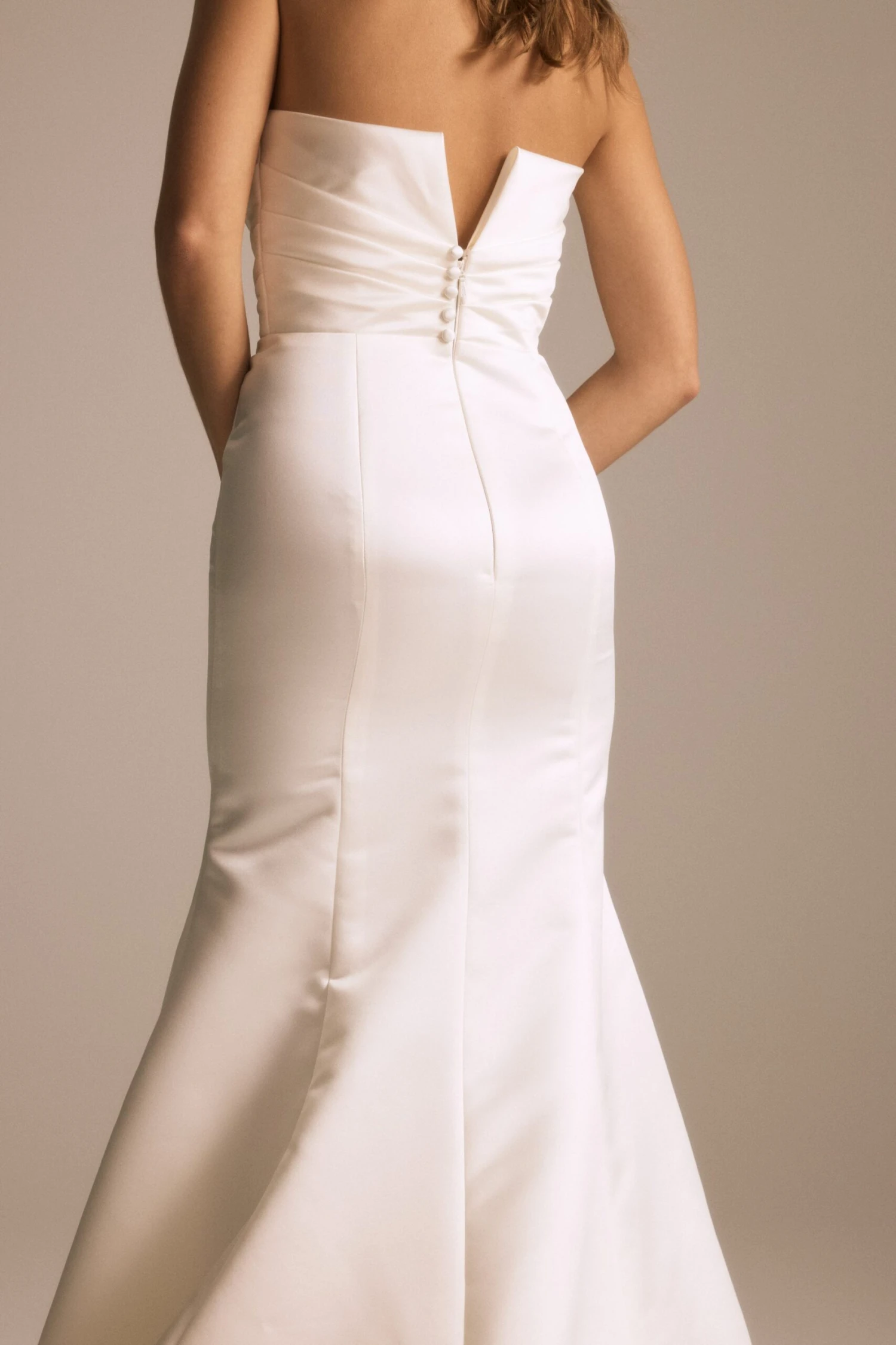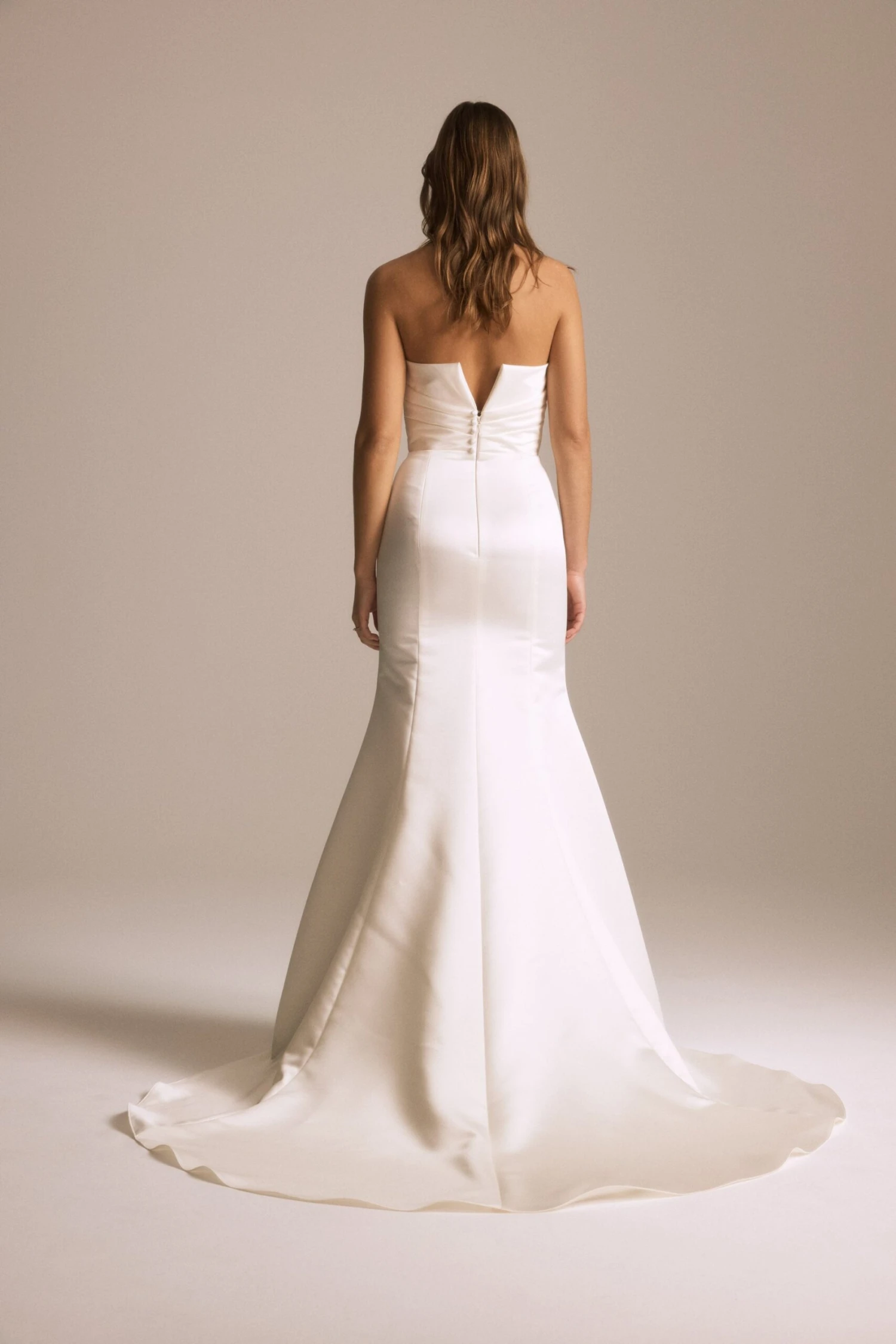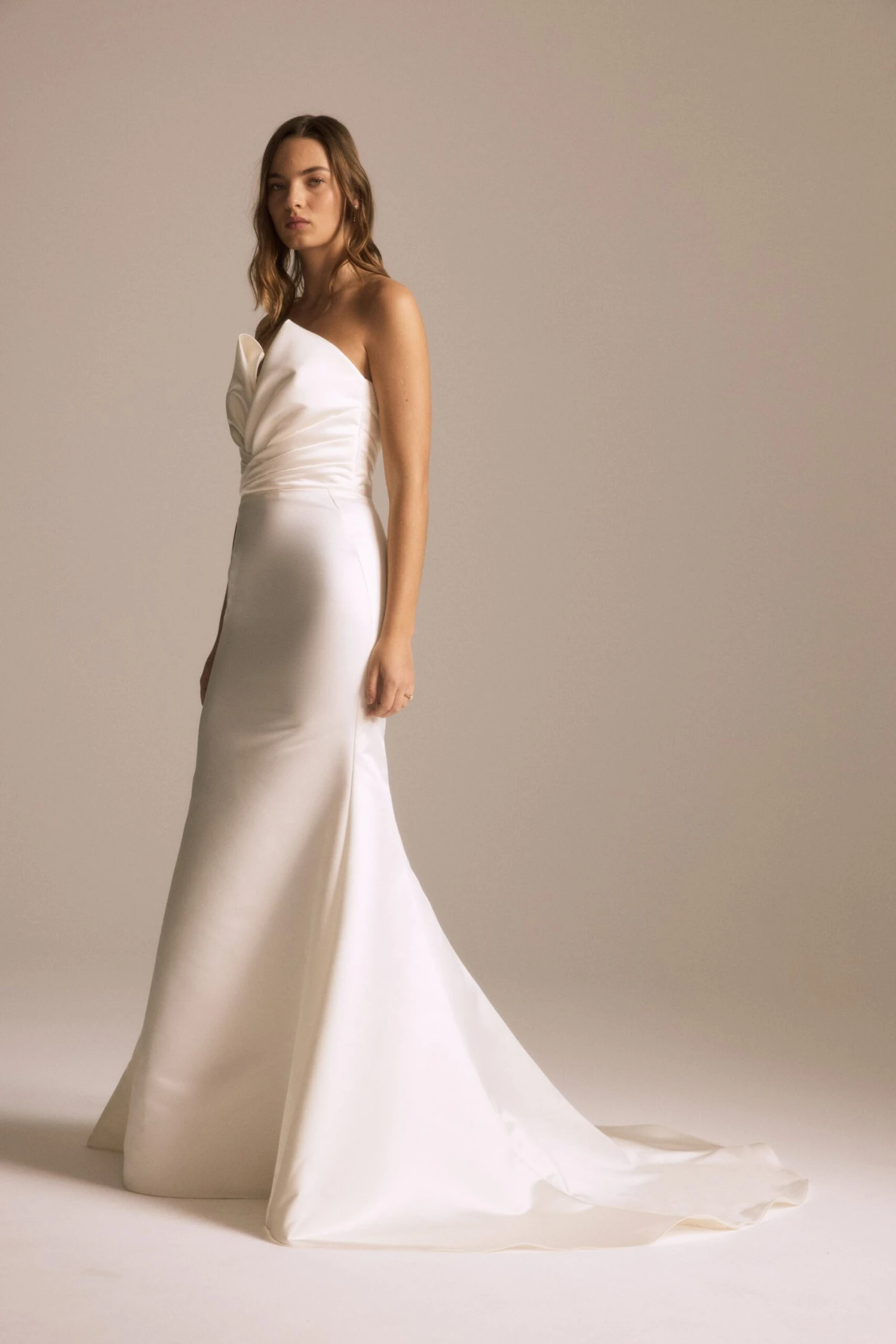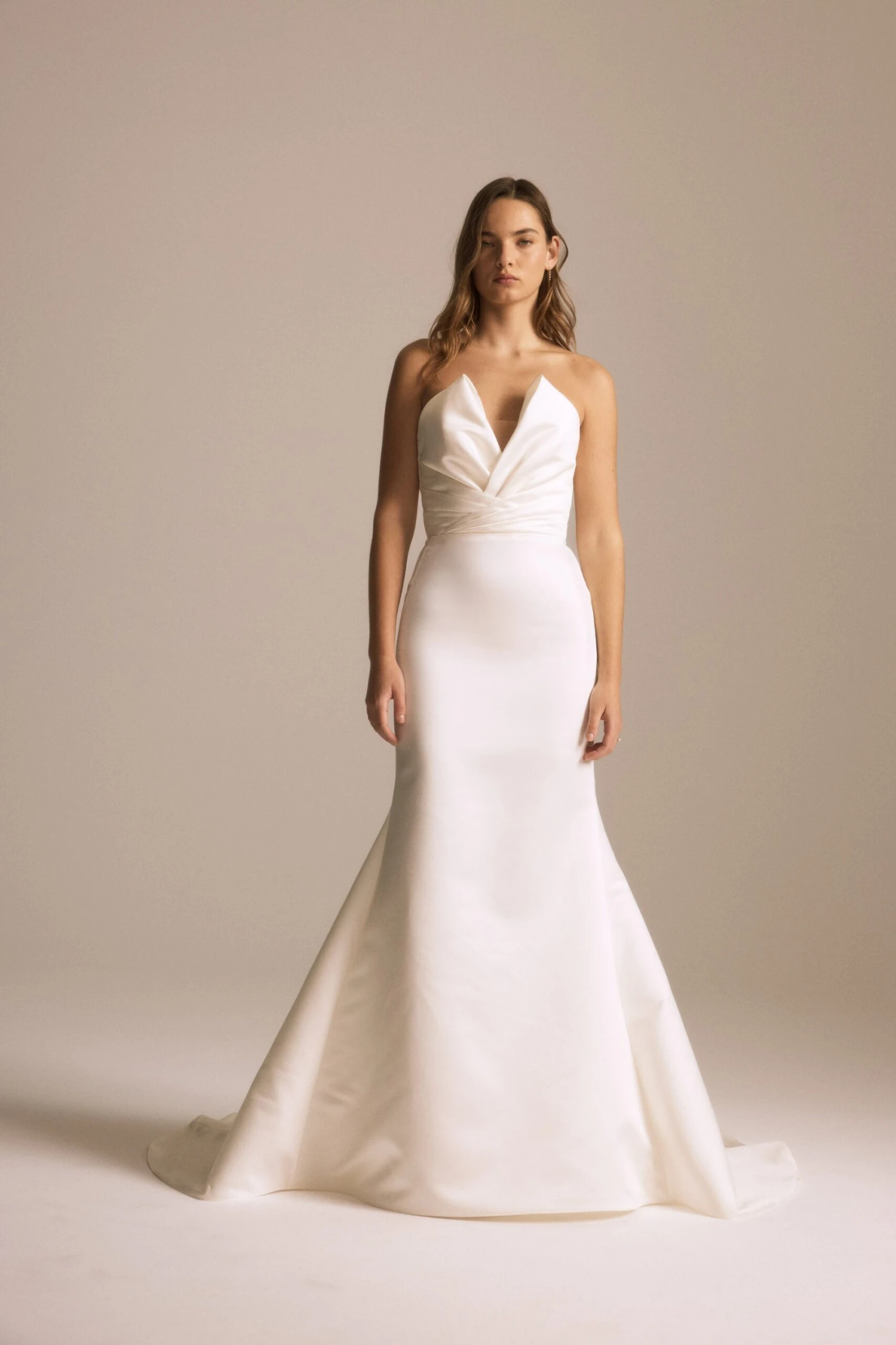 Duchess satin plunge V-neck draped fit-to-flare gown.