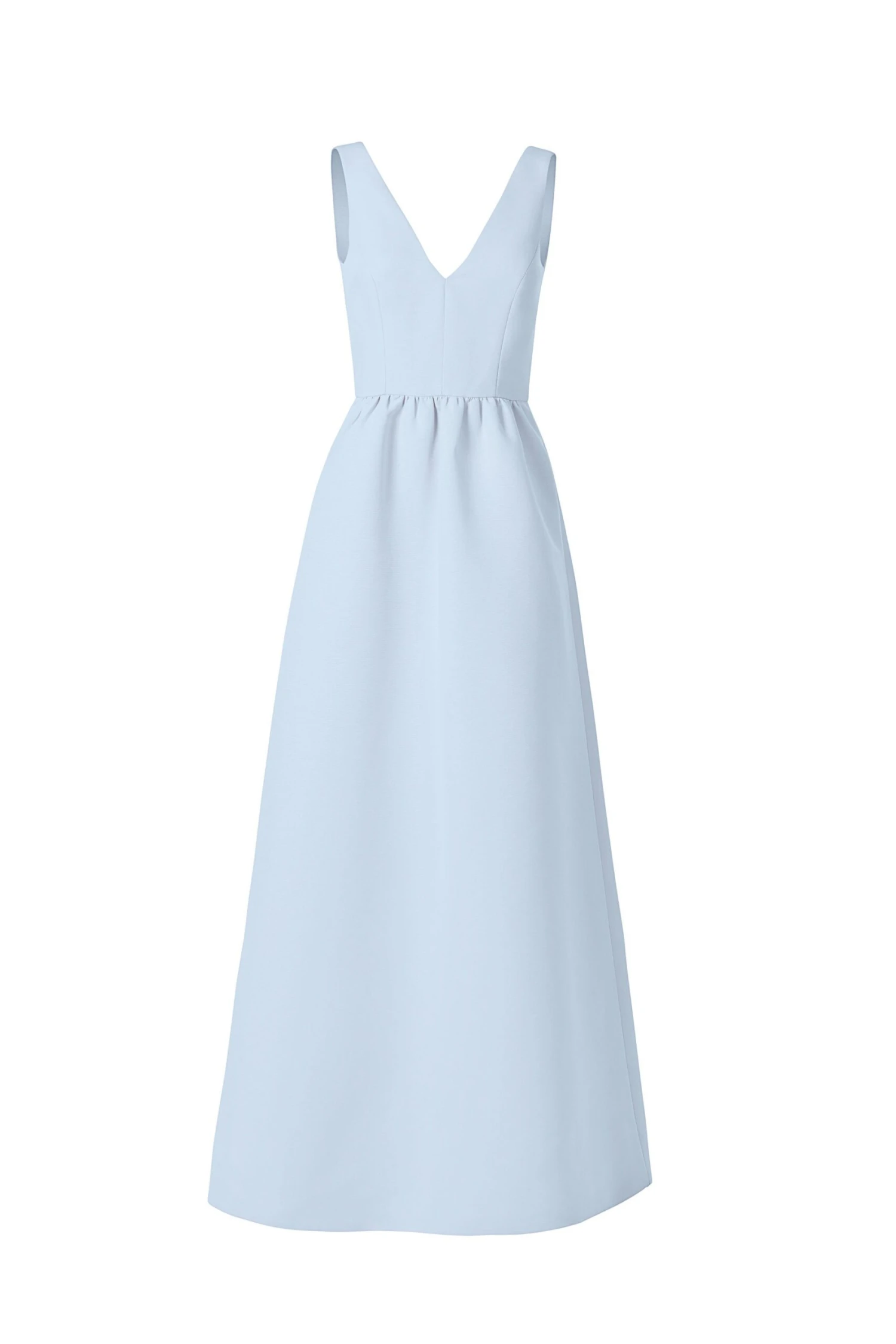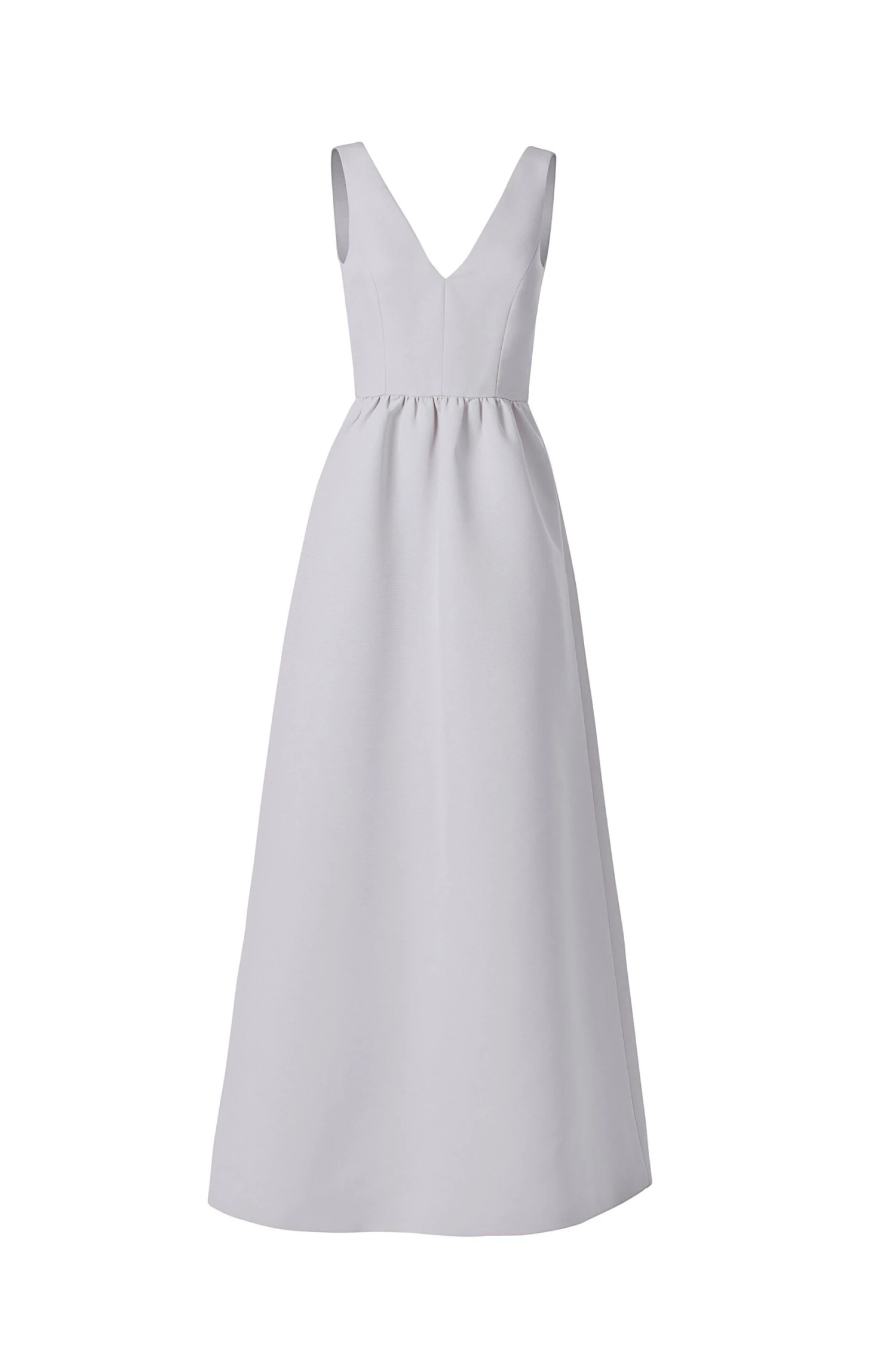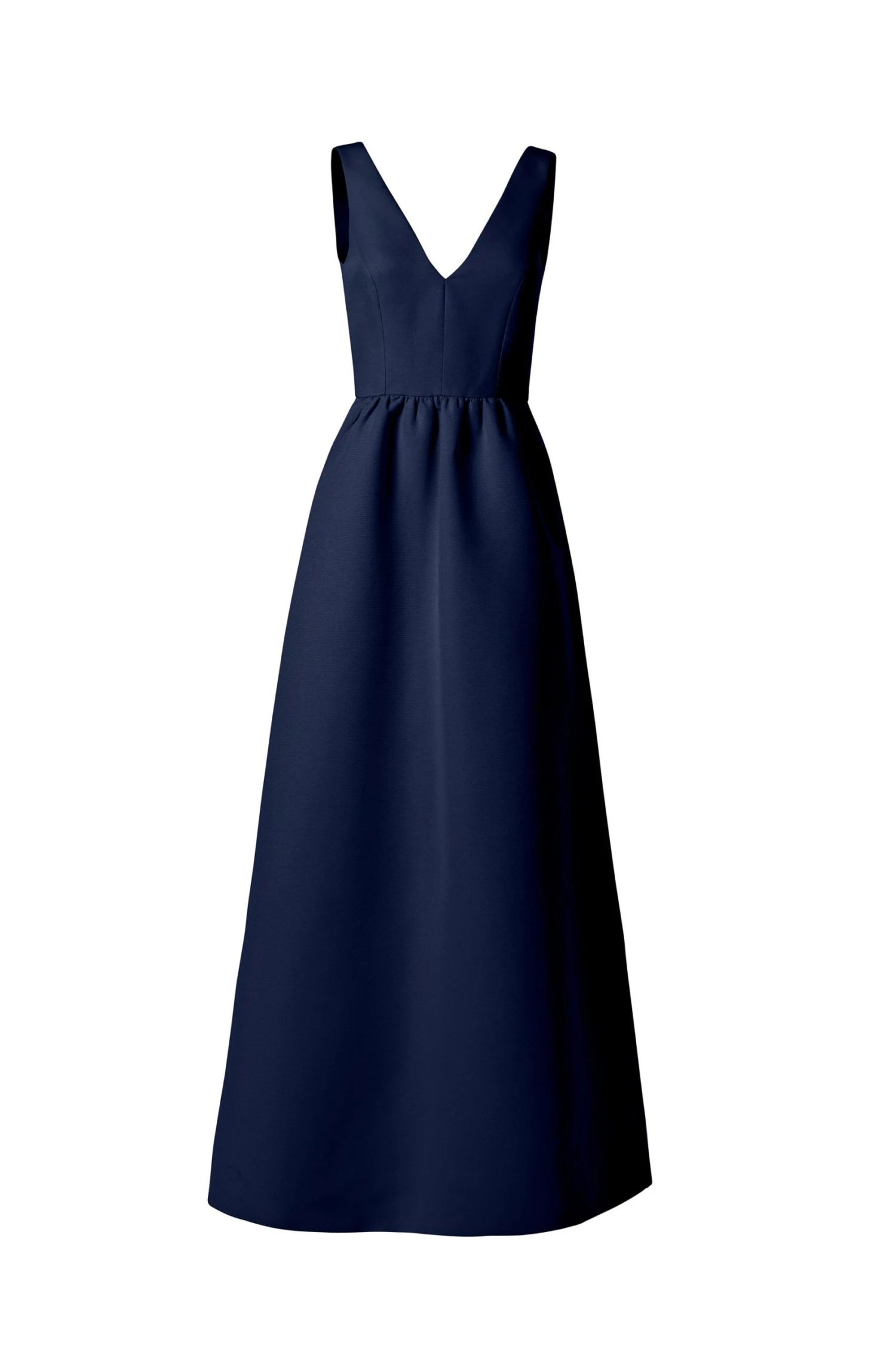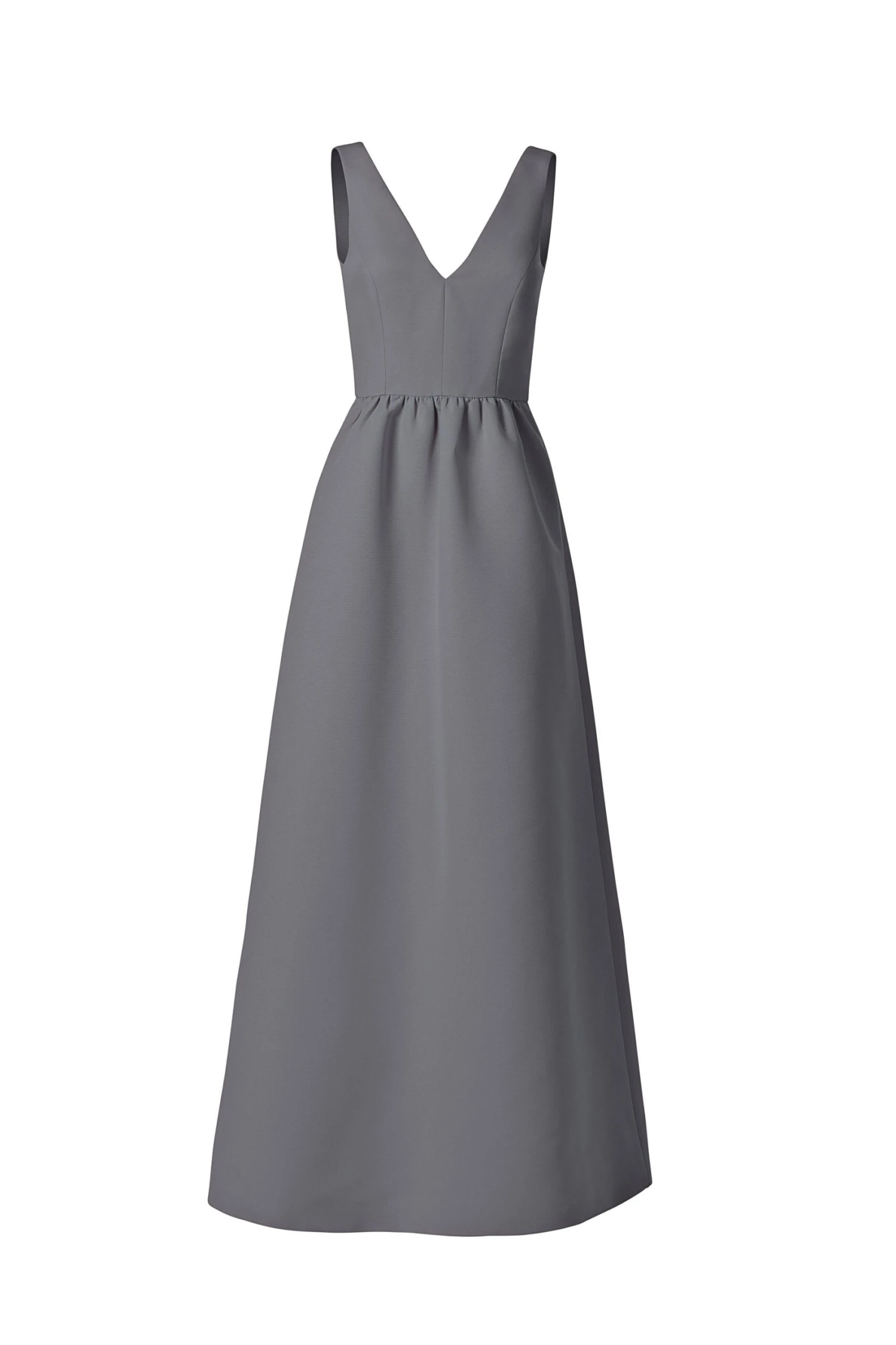 A classic V-front and back bodice nips in at the waist then extends out into a full dirndl skirt in this faille gown, and side pockets lend casual elegance.