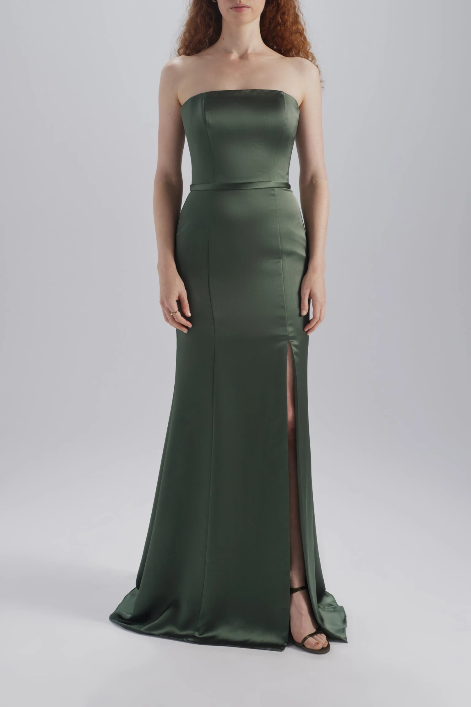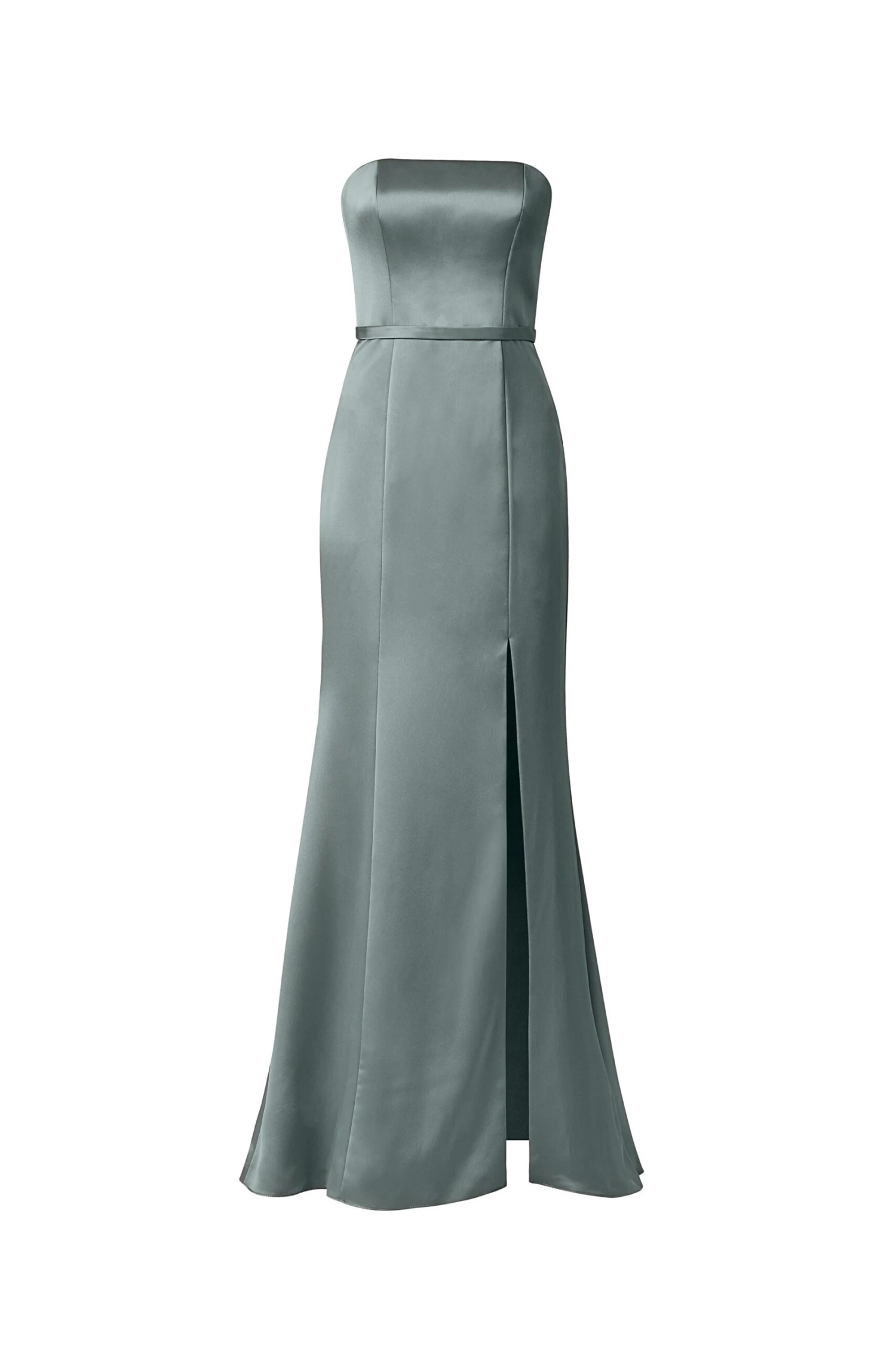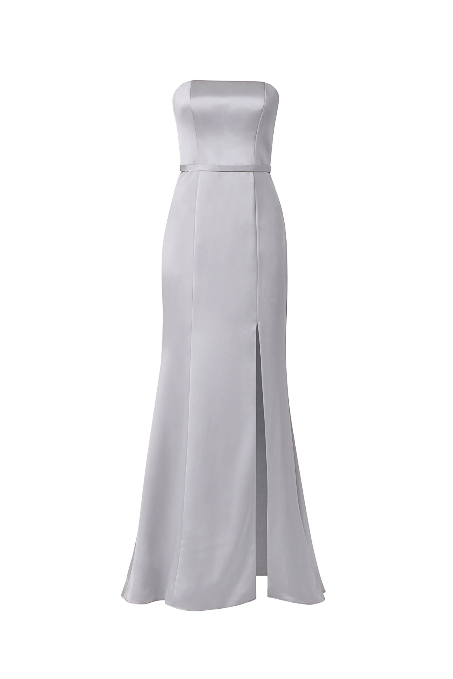 Subtle shine and a strong silhouette make this strapless fluid satin style stand out, and a thin ribbon at the waist and off-center slit in the fit-to-flare skirt complete the look.